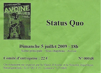 Status Quo demarre à 18h05 !!! 5 minutes de retard..Dave Salt n'aurait jamais toléré cela !! ha ! En grande forme malgré la chaleur, le groupe est arrivé en avion et train et part aussitôt après le concert pour Carcassone. Ambiance familiale dans la salle, pas de bousculade, des premiers rangs ... clairsemés, de l'espace, sans doute la chaleur. Très belle ambiance pour des locaux qui découvraient sans aucun doute le groupe. Un groupe en pleine forme (Bruno).